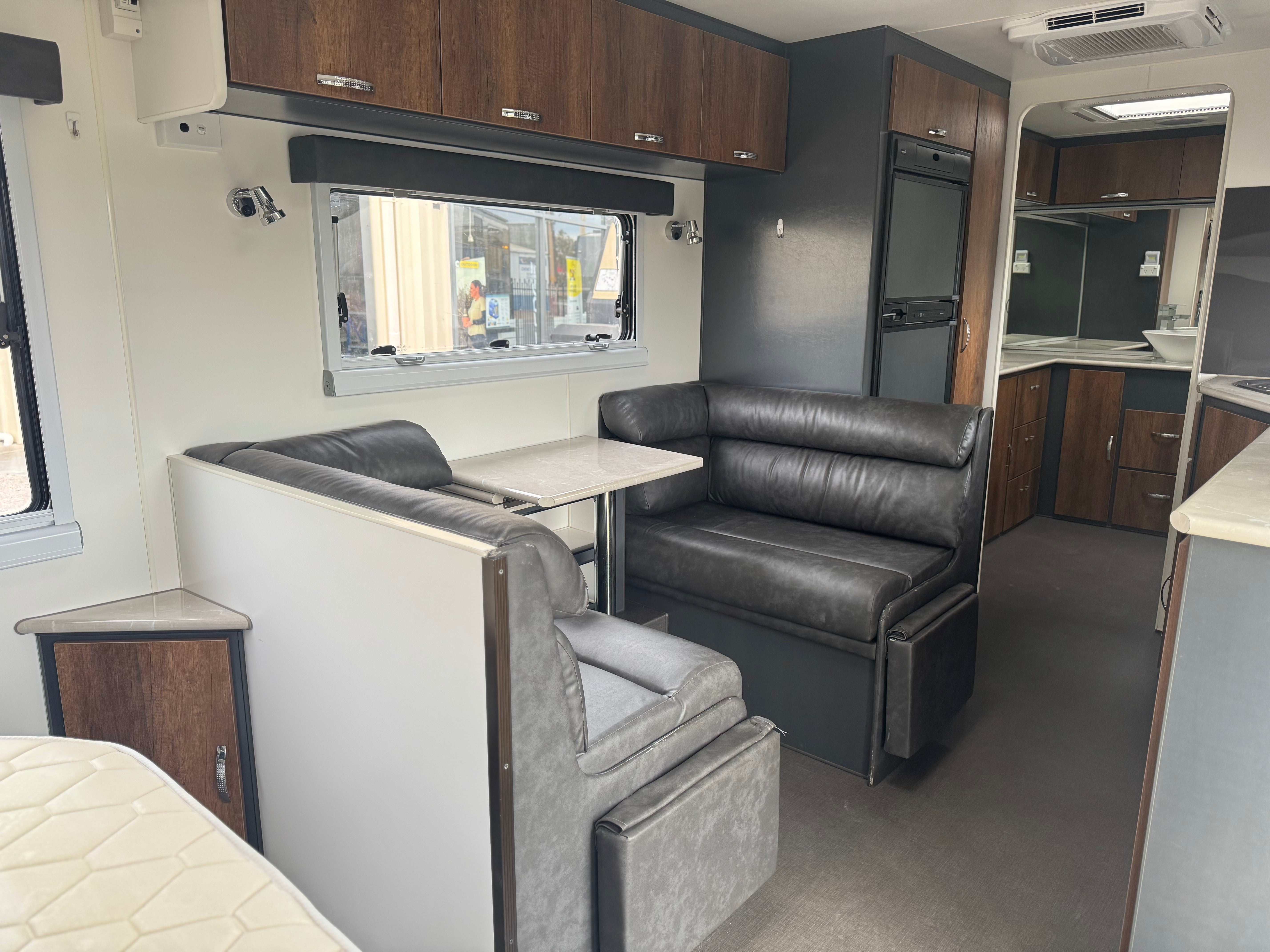 Step inside and you’re welcomed by a roomy 23ft layout that feels more like a home than a caravan. The caravan queen bed promises a restful night’s sleep, while the booth shaped lounge provides a comfortable spot to relax, dine, or entertain. A full ensuite at the rear with shower, toilet and sink gives you privacy and convenience on the road, making long trips effortless.