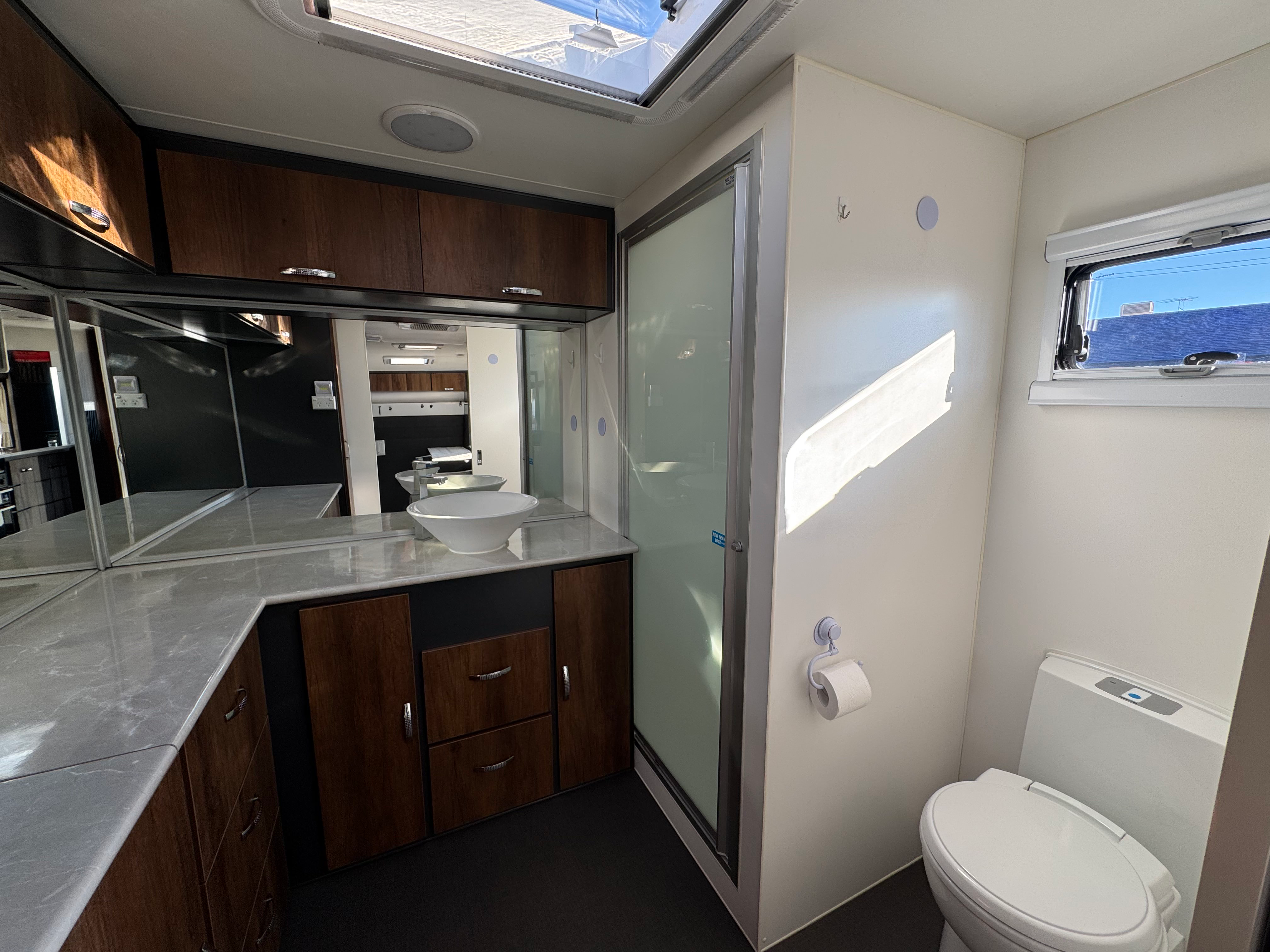 One of the standout features of this van is its large, beautifully designed ensuite. With a roomy layout that feels more like a home bathroom, it includes a separate cassette toilet plus spare cassette and toilet lid, vanity with generous bench space and storage, washing machine, large mirrors, and a separate shower. It even has a dedicated closet for extra practicality – making life on the road feel effortlessly comfortable.