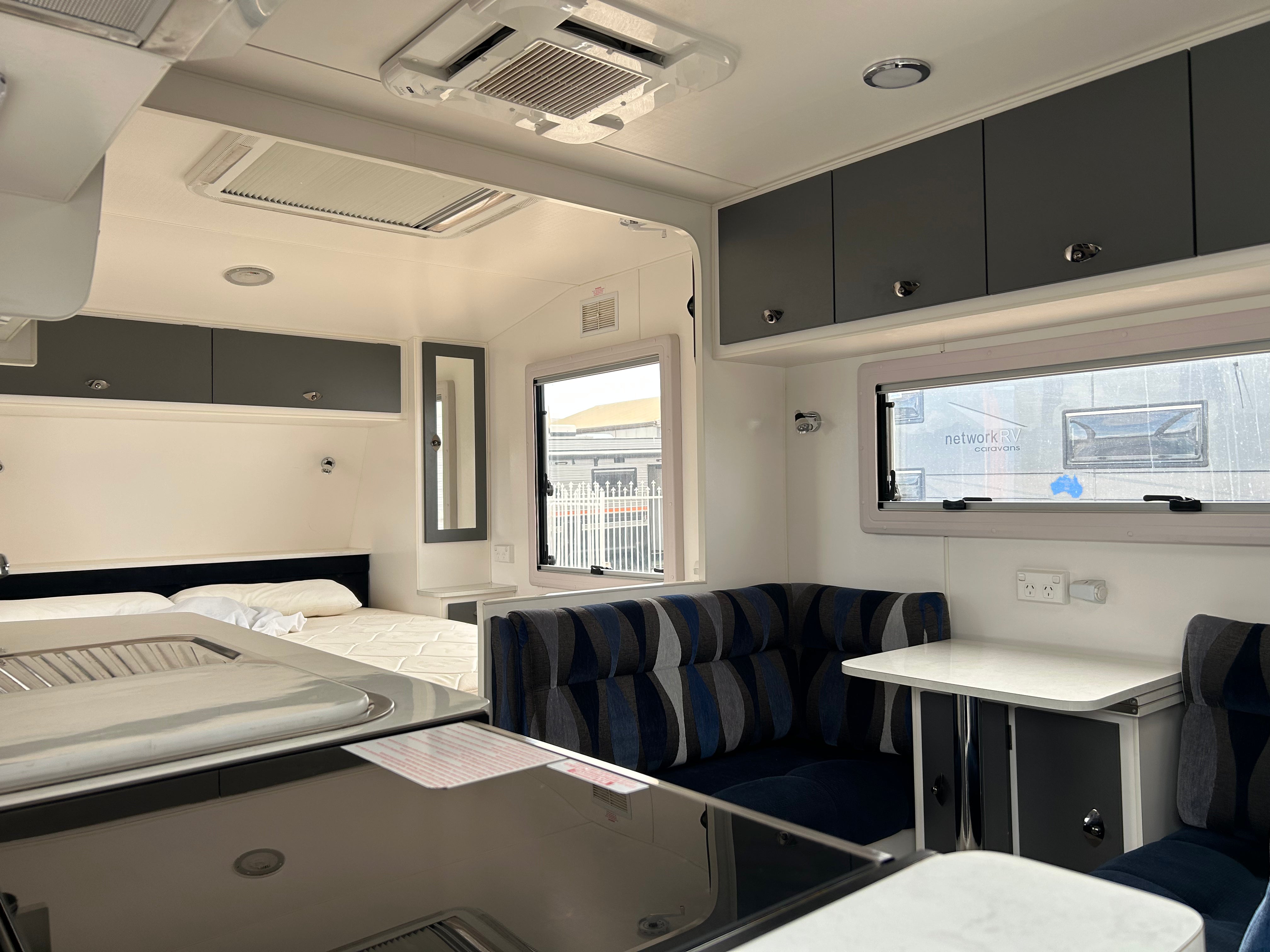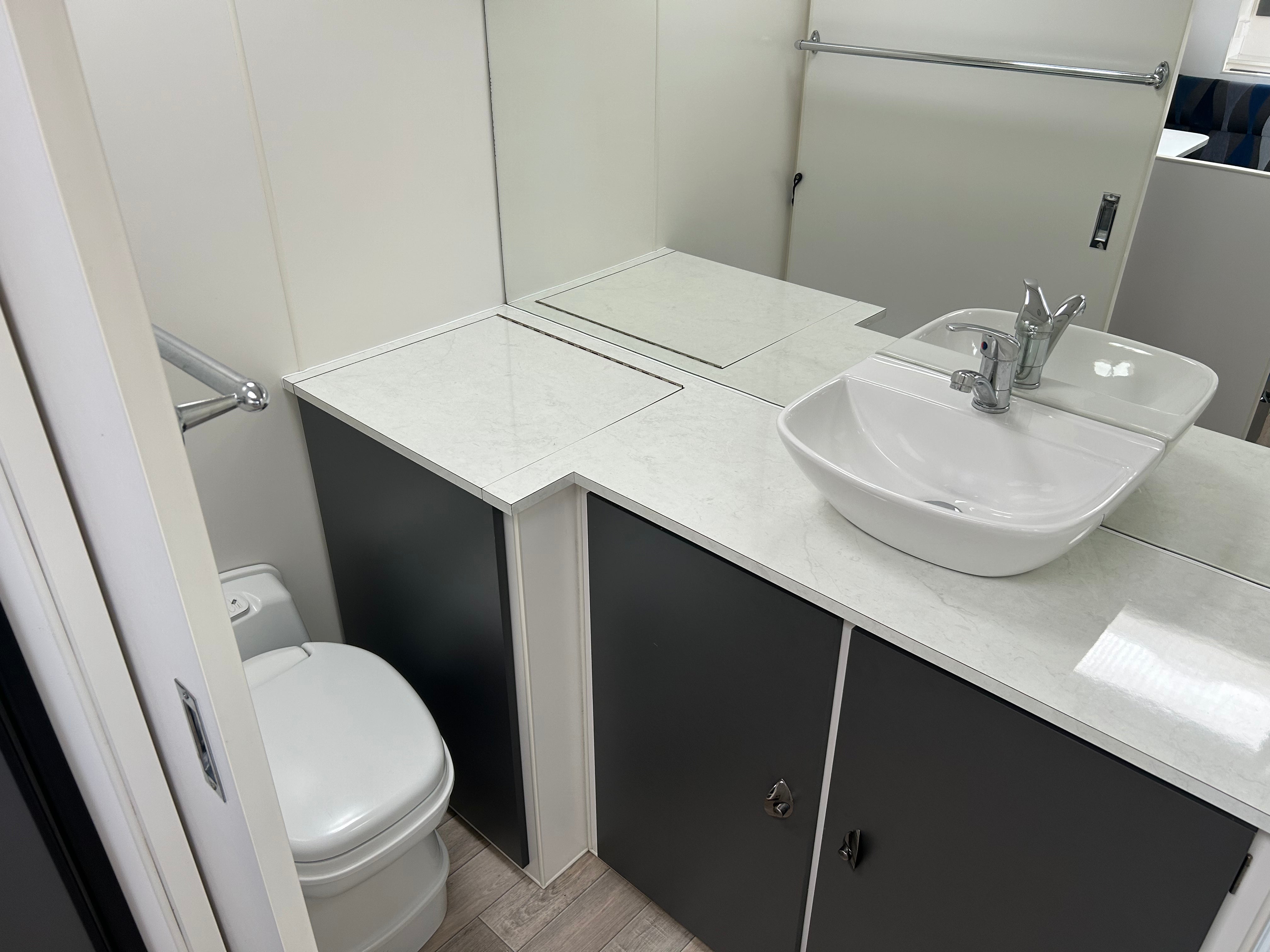 A full rear bathroom provides the ultimate convenience, offering a separate toilet, modern vanity with raised basin, and a large shower with built-in shelving. The spacious design allows for easy movement, while high-end fittings add a touch of elegance. Perfect for long trips, this ensuite ensures you have all the comforts of home.