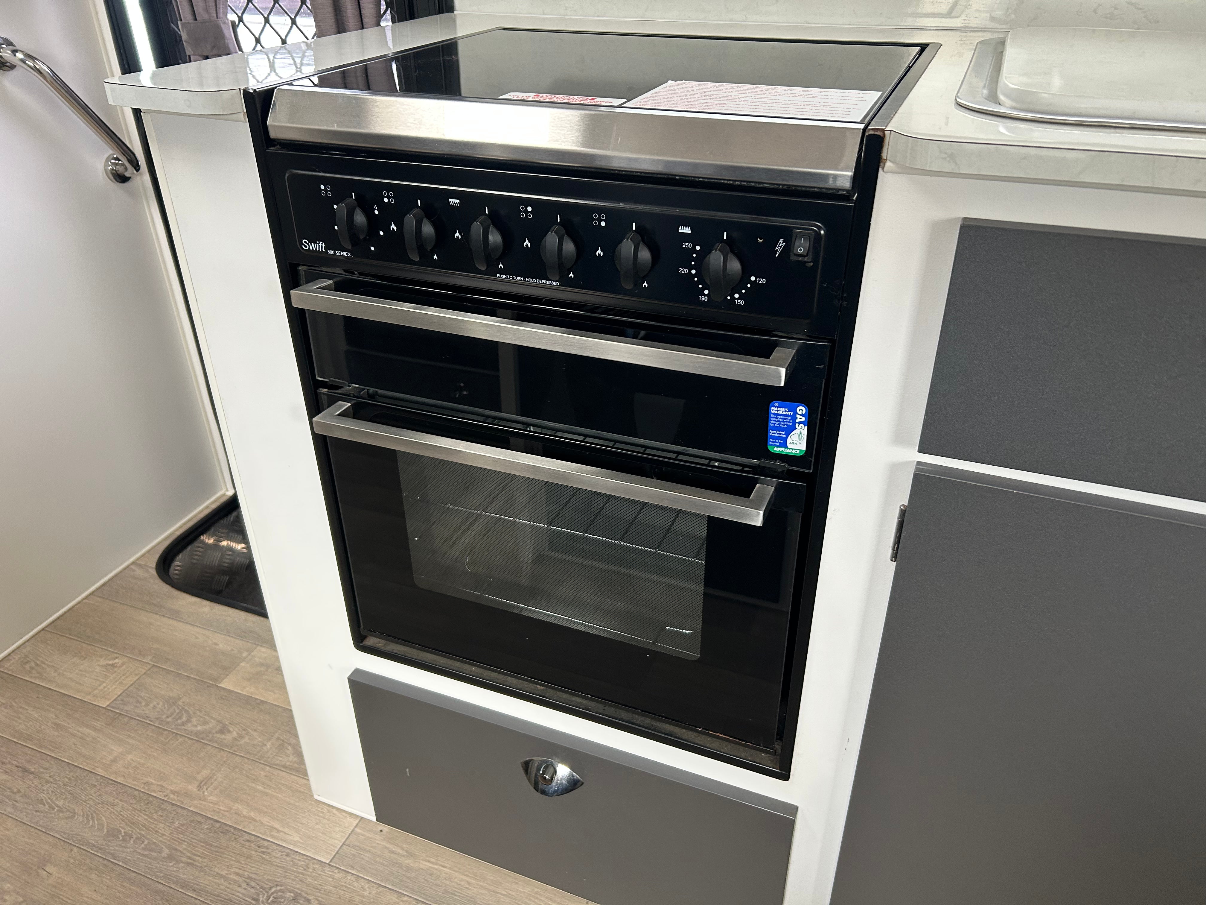 Cooking Equipment: Cook-Top 3 Gas Burner and 240v Electric Single Griller, Microwave, Rangehood with 12v Twin Fans and Lighting
