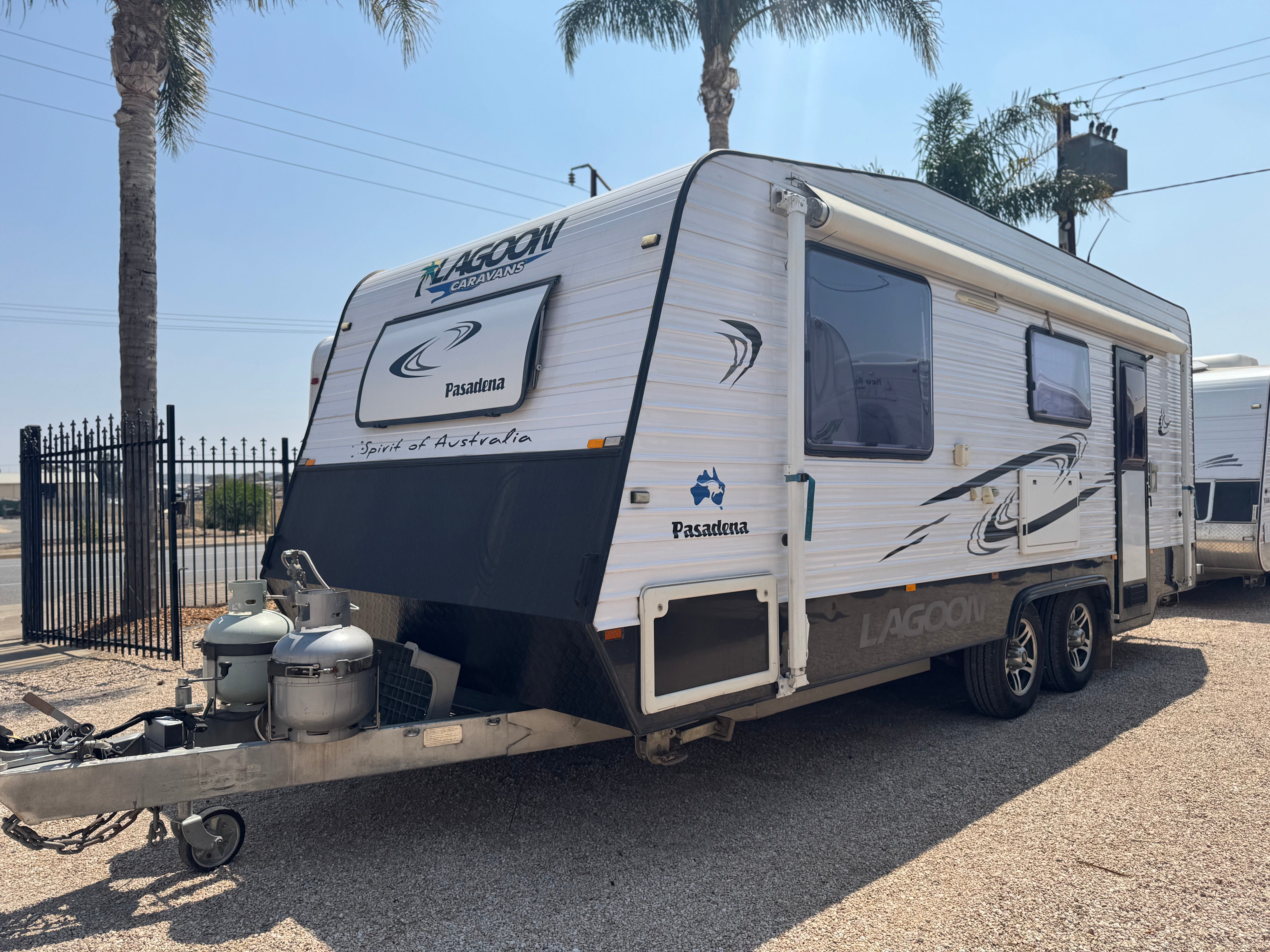 This well-built and stylish 2014 Lagoon Pasadena offers comfort, practicality, and a spacious interior, perfect for touring. It features a durable aluminium-clad exterior with a roll-out awning, twin gas bottles, and a rear-mounted spare wheel. Inside, the warm timber cabinetry, cafe-style dinette lounge, and queen bed provide a comfortable living space.