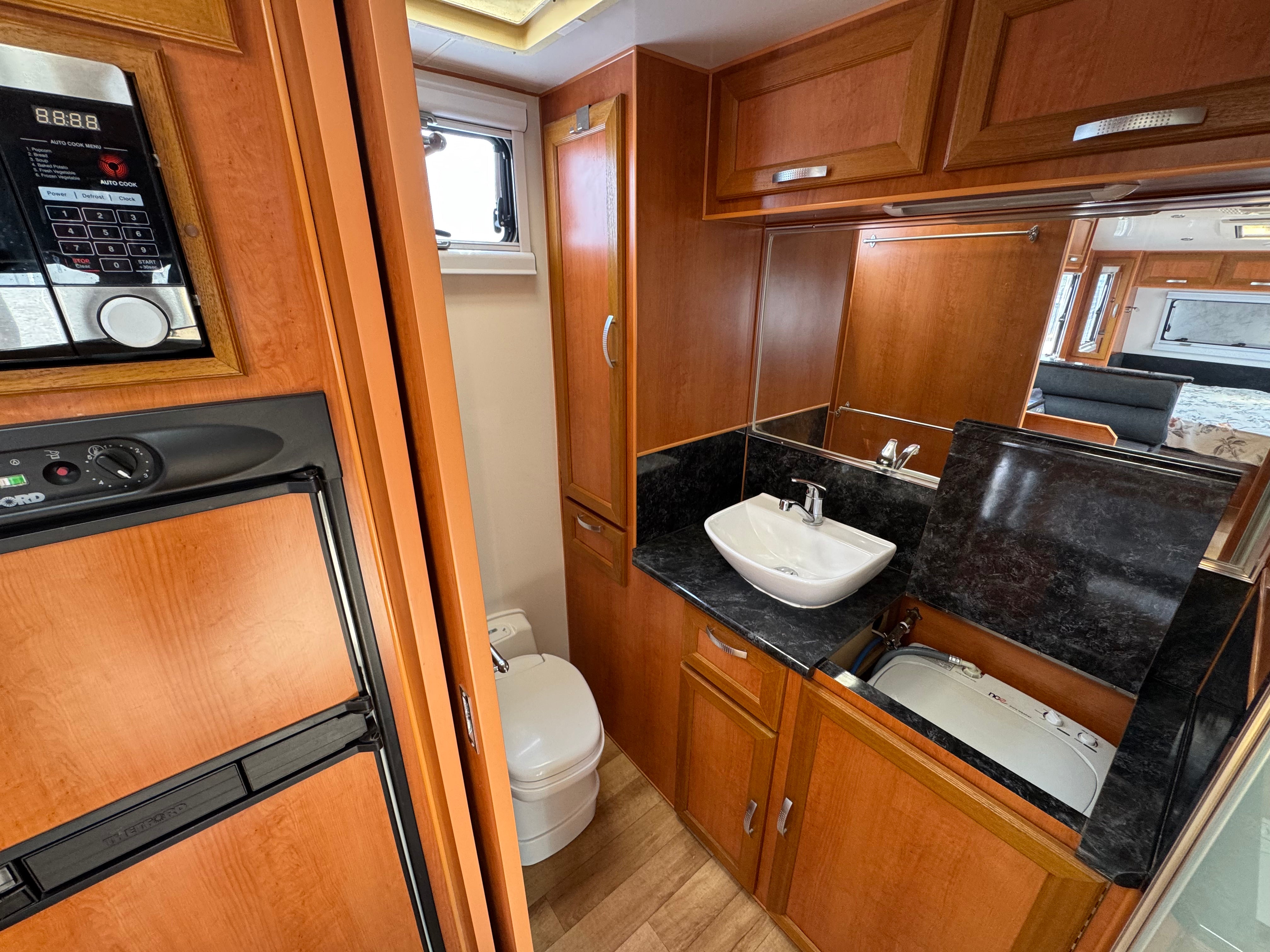 The well-appointed rear ensuite provides all the essentials, including an internal shower, a cassette toilet, and a ceramic basin. The top-loading NCE washing machine adds extra convenience, making this van perfect for longer trips. A gas and electric hot water system ensures hot showers wherever you travel.